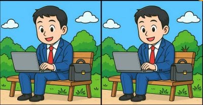 Taigi, ar esate pasiruošę kitam iššūkiui? Pažvelkite į šias dvi vyro, dirbančio su nešiojamuoju kompiuteriu parke, nuotraukas. Iš pirmo žvilgsnio nuotraukos gali atrodyti vienodos, tačiau jose slypi 3 skirtumai, o jūsų užduotis – kuo greičiau jas surasti. Ar galite juos visus rasti tik per 75 sekundes? Išbandykite šį galvosūkį ir patikrinkite, koks aštrus jūsų regėjimas!